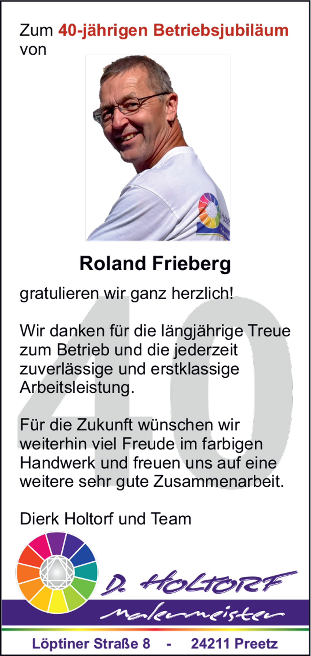 Aktuelles Dierk Holtorf 28 Januar 2020 40 Jahre im Betrieb Roland "Herzlichen Glückwunsch zum 40-jährigen Betriebsjubiläum!"